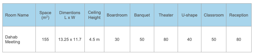 With a capacity of up to 80 people and equipped with the latest in audio/visual solutions – from cutting-edge data projectors to motorized screens, the Safir Dahab's meeting room is here to serve your needs.